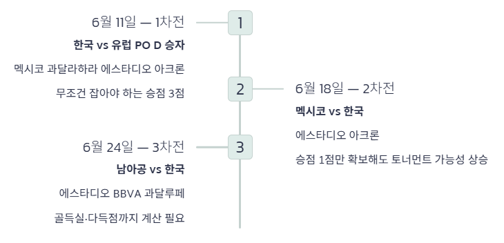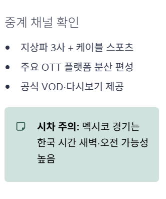 한국 경기는 모두 멕시코에서 열리기 때문에 시차를 고려하지 않으면 평일 새벽·오전 시간대에 경기를 놓치는 손해를 보기 쉽습니다.