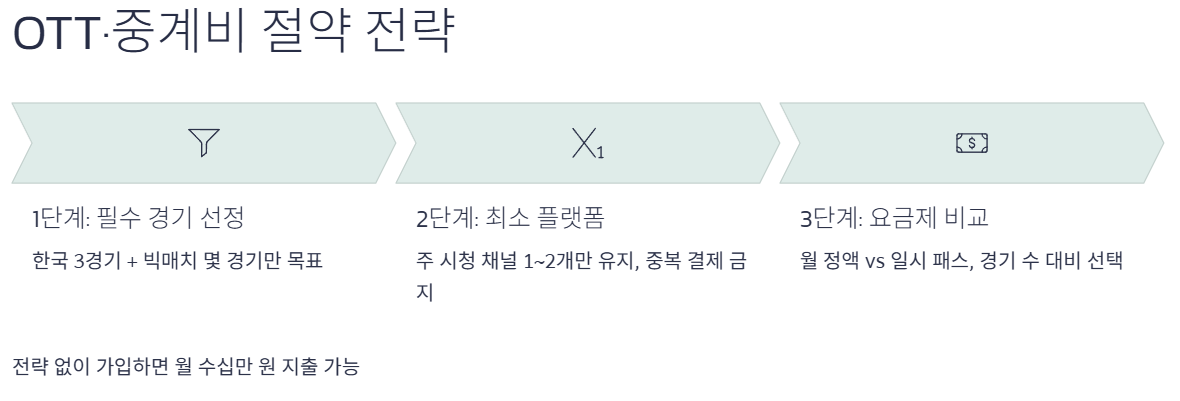 - OTT는 월 정액·일시 패스·스포츠 전용 패키지 등 상품이 다양해, 내가 실제로 볼 경기 수에 비해 과한 요금제를 선택하지 않는 것이 중요합니다.