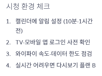 - 집 TV·셋톱박스·모바일·태블릿·노트북 중 어떤 조합으로 볼지 정하고, 각 기기에서 공식 앱 로그인·업데이트를 미리 해둡니다.