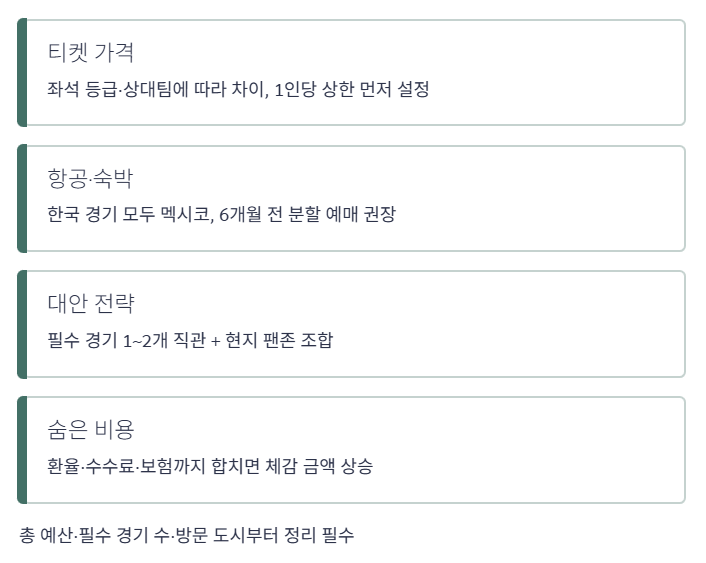 - 조별리그 3경기 전부를 직관하는 대신, 필수 경기 1~2경기 + 현지 팬존 시청 조합으로도 현장 분위기를 충분히 즐길 수 있습니다.