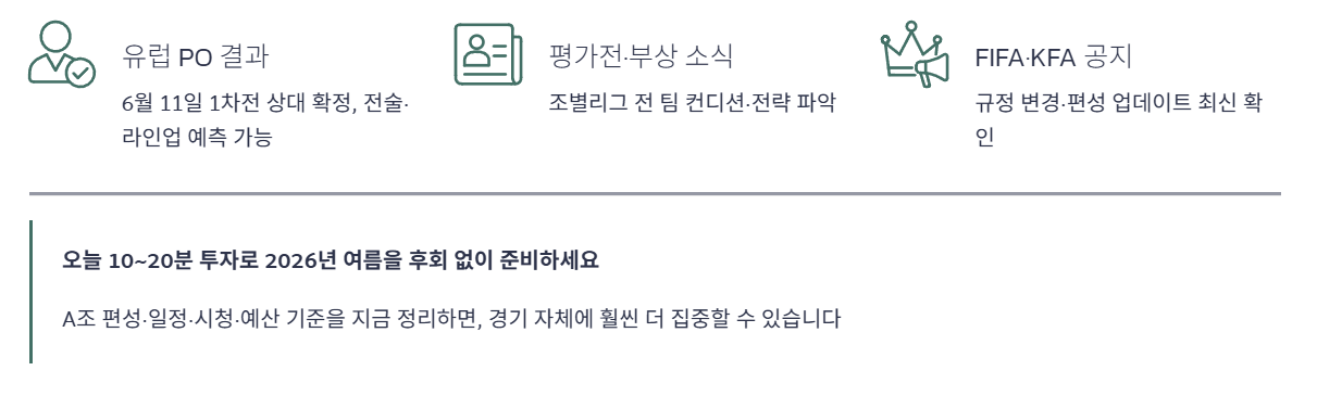 조추첨이 끝났다고 해서 모든 정보가 멈추는 것은 아니며, 유럽 플레이오프·평가전·부상·전술 변화 등 변수가 계속해서 쌓입니다.