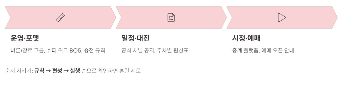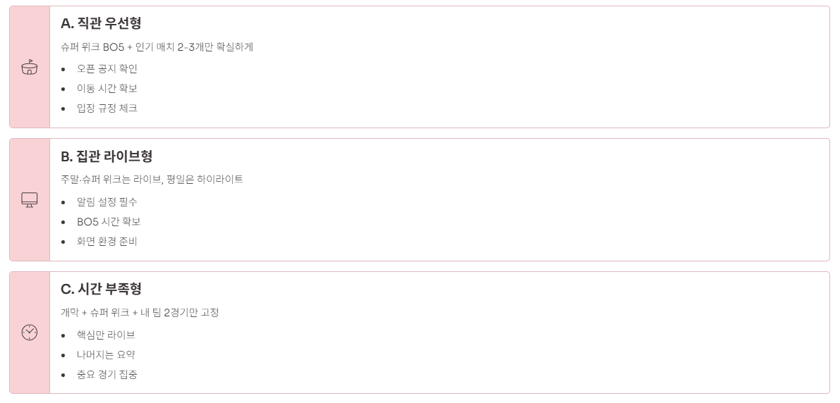 | A(직관) | 슈퍼 위크 BO5 중심 + 2~3경기만 | 오픈 공지 확인 / 이동시간 확보 / 입장 규정 체크 |