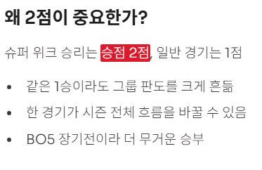 - 승부처: 3주 차 슈퍼 위크(BO5/승점 2점)