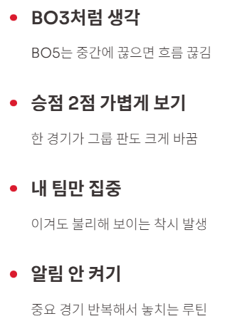 가장 큰 손해는 ‘못 본 경기’가 아니라, 가장 재밌는 구간(승점 2점 BO5)을 통째로 놓치는 겁니다.