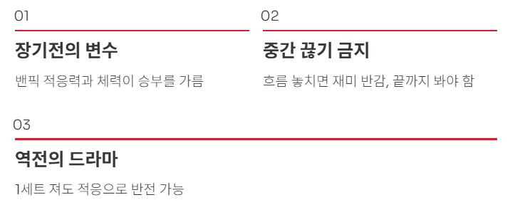 - BO5는 길어질 수 있어 중간에 끊으면 재미가 반감됨