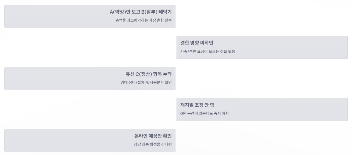 가장 많이 터지는 건 “할부금 착각”과 “결합 영향 누락”입니다. 이 2가지를 막는 것만으로도 체감 손해가 크게 줄어요.