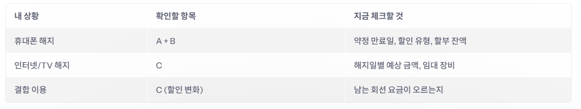 | 3) 결합 영향 | 내 해지로 남는 회선 요금이 오를 수 있음 | 해지 후 요금 변화 확인 |