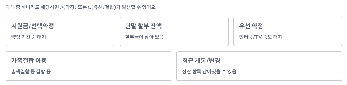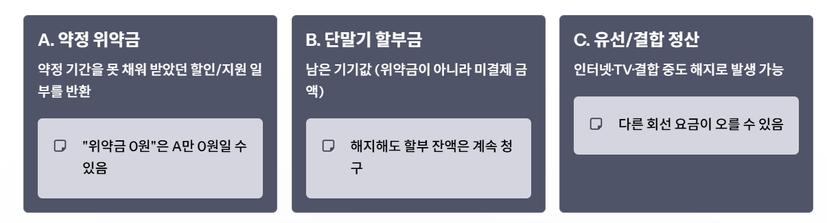 아래 중 하나라도 해당하면, 해지 시 A(약정 위약금) 또는 C(유선/결합 정산)가 발생할 수 있습니다. 그리고 A가 0원이어도 B(할부 잔액)가 남아 있으면 총액은 커질 수 있어요.
