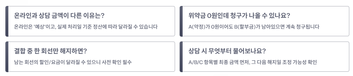 FAQ 결론: 온라인은 ‘예상’, 상담은 ‘최종’. A/B/C 분리만 지키면 대부분의 혼란이 사라집니다.