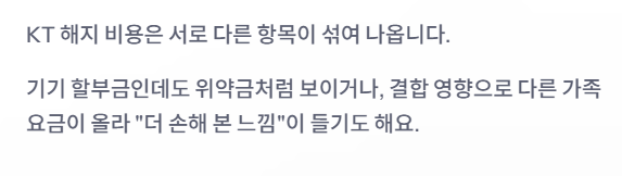 KT 해지 비용은 보통 “위약금 1개”가 아니라, 서로 성격이 다른 항목이 섞여 나옵니다. 그래서 실제로는 기기 할부금인데도 위약금처럼 보이거나, 결합 영향으로 다른 가족 요금이 올라 “더 손해 본 느낌”이 들기도 해요.