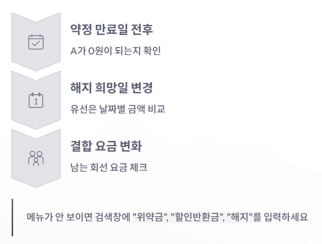 메뉴가 바뀌거나 찾기 어렵다면, 앱/홈페이지 검색창에 “위약금”, “할인반환금”, “해지”를 입력해 진입하는 방식이 가장 빠릅니다.