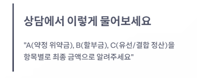 상담 시에는 아래 문장을 그대로 말하면 가장 빠릅니다: “A(약정 위약금), B(할부금), C(유선/결합 정산)을 항목별로 최종 금액으로 알려주세요.”