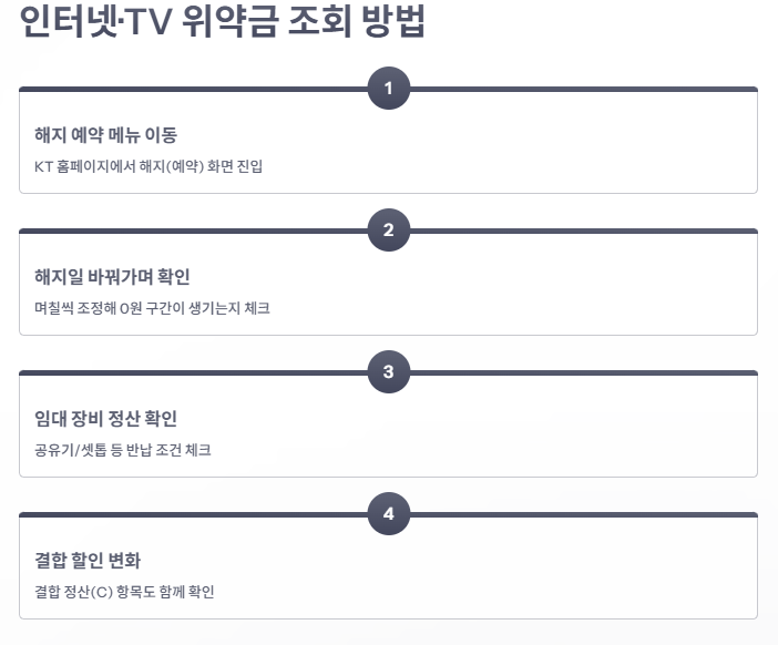 인터넷/TV는 해지(예약) 화면에서 “예상 위약금/할인반환금”을 볼 수 있는 경우가 많습니다. 핵심은 해지 희망일을 바꿔가며 0원 구간이 생기는지 확인하고, 마지막에 최종 정산 항목이 있는지 확정하는 것입니다.